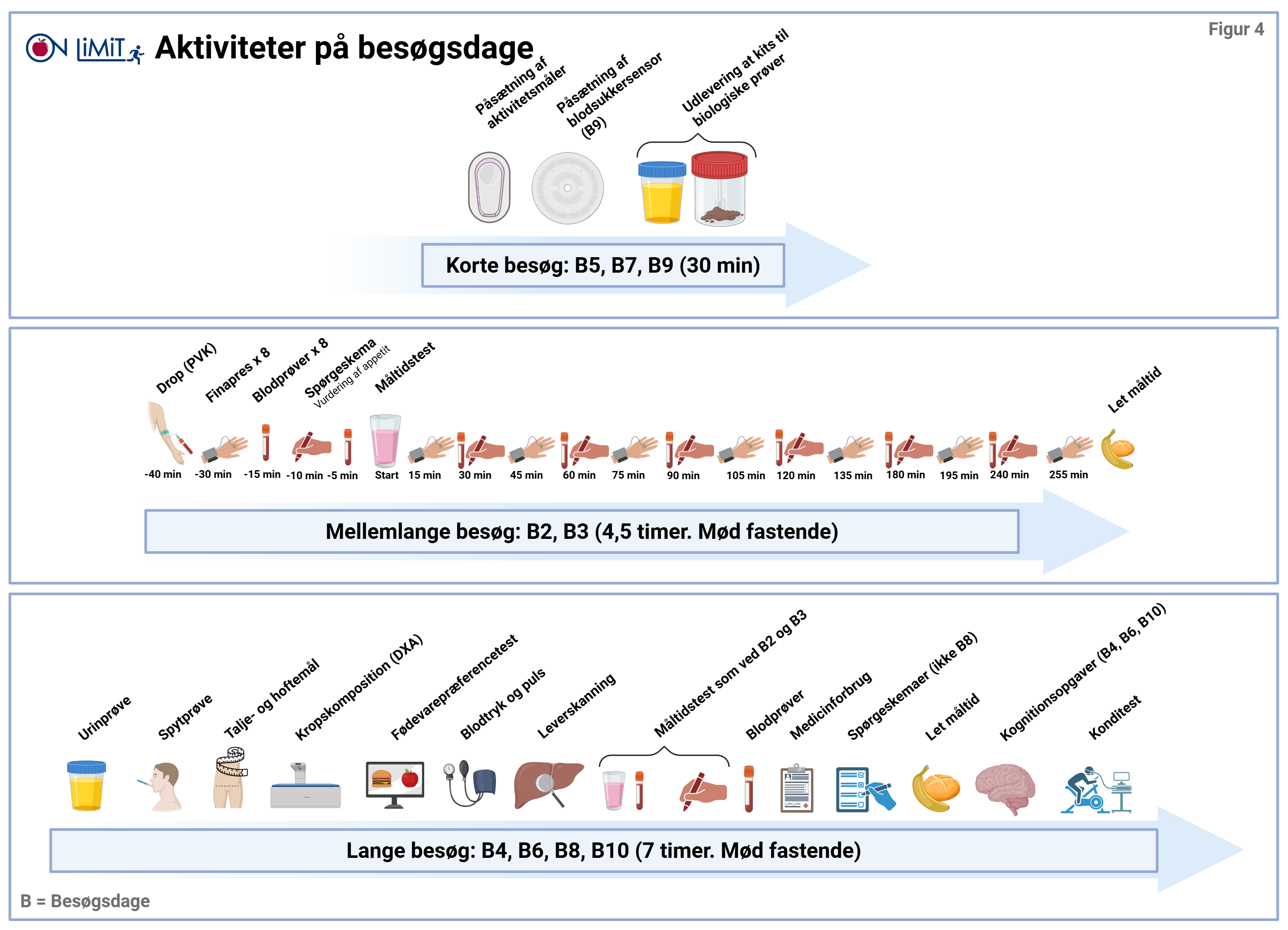 Du skal fortsætte med at spise i overensstemmelse med din tildelte diæt, og du skal bruge din viden fra fase 2 til selv at stå for indkøb og madlavning. De to ugentlige holdtræninger med instruktør og din individuelle træning fortsætter, og du vil fortsat få betalt dit medlemskab i PureGym. Du vil løbende blive støttet af diætister og træningsinstruktører. Besøg og tidsforbrug I løbet af de 52 uger som projektet varer, skal du møde op til 10 forsøgsdage på Steno Diabetes Center Copenhagen i Herlev. Der vil ud over screeningsbesøget være 3 korte besøg (ca. 30 minutter per besøg), 2 mellemlange besøg (ca. 4,5 timer per besøg) og 4 lange besøg (ca. 7 timer per besøg). Du skal møde fastende til de mellemlange og lange besøg. Du vil sammen med en projektmedarbejder planlægge dine forsøgsdage, så de passer med din kalender. Du skal derudover møde op til 2 langtidsblodsukkermålinger, når der er gået cirka 30 og 42 uger. Du vil også skulle deltage i 5 gruppeinterviews gennem projektperioden. Figuren nedenfor viser varigheden af de enkelte besøgsdage samt hvornår de er placeret i projektforløbet. Hvis du ønsker at læse om hvert enkelt besøg, kan du finde mere information i den fulde deltagerinformation som du kan hente på toppen af siden.