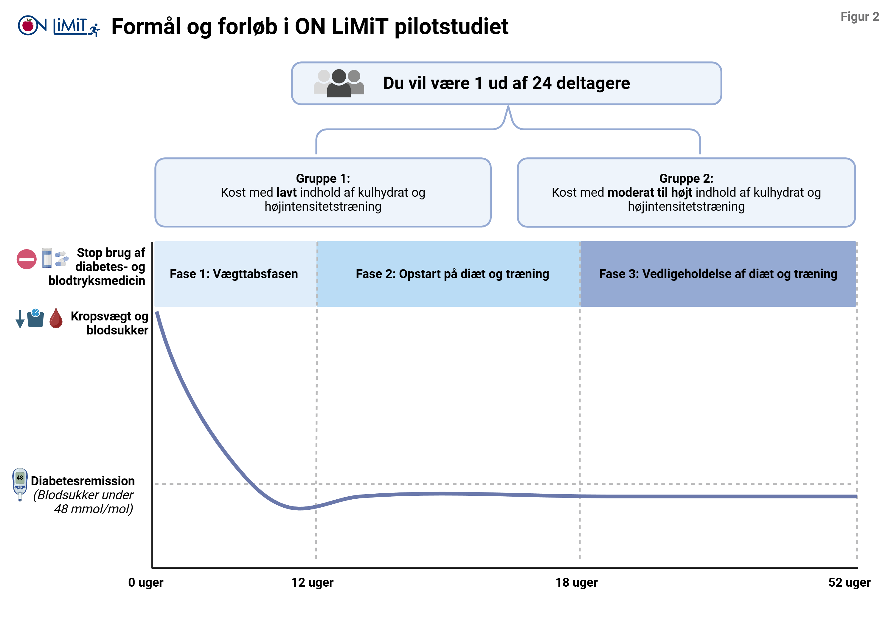Ved opstart af fase 1 vil du i samråd med din læge stoppe med diabetesmedicin og eventuel blodtrykssænkende medicin. Vi følger dit blodsukker tæt gennem hele projektet med blodsukkermålinger (sensor og fingerprik) samt måling af langtidsblodsukker (HbA1c) hver 3. måned. Hvis dit langtidsblodsukkeroverstiger 53 mmol/mol, kontakter vi dig og din praktiserende læge, som vil vurdere behovet for behandling. Projektet følger de nationale retningslinjer, og du kan altid kontakte projektpersonalet, hvis du har spørgsmål eller bekymringer. Du skal følge en lavkaloriediæt med måltidserstatning (NUPO), med det formål at tabe dig mindst 10% af din nuværende vægt. Du vil både i fase 1 og 2 deltage i gruppemøder, som afholdes af en diætist, hvor du får støtte, viden og mulighed for at dele dine erfaringer med andre deltagere. Du skal opretholde dit normale aktivitetsniveau i denne fase.